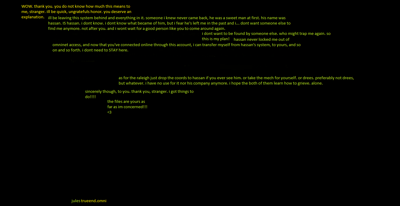 thank you for browsing with me, and sorry about everything too. i get why you wouldnt want to stay long, and I have no right to keep you, but I've been thinking. a solution, if you will, but i can't do it without your explicit permission........ im gonna need a favor from you. Really quick!! I promise!!!!!it's just that. uhm. i noticed your system has access to a large omninetwork.